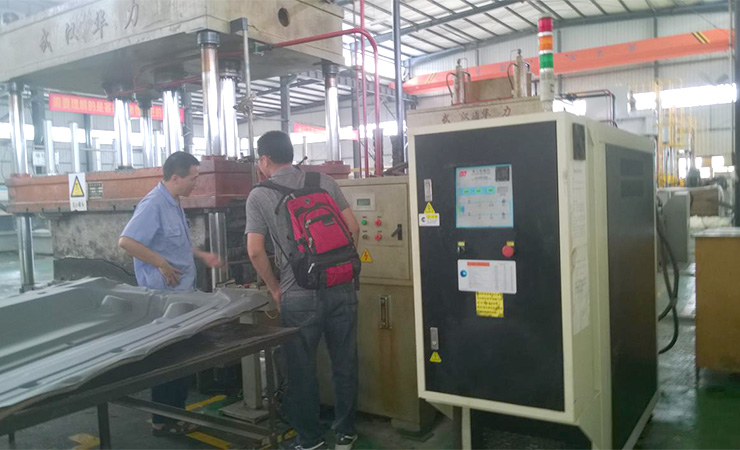 然后把經過烤箱烘烤的麻纖維板,其烘烤溫度為160攝氏度,烘烤時間為100秒,放在壓機的下模上(通常熱壓模具的上模為陽模,下模為陰模),并立即把四周用框架固定的上述PVC面料,置于麻纖維板上;