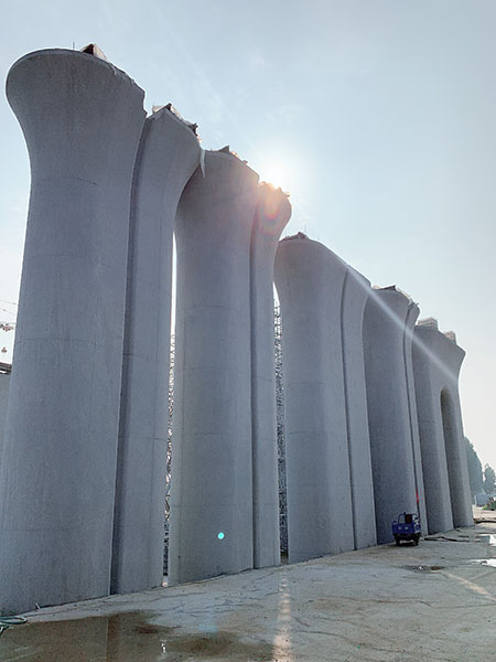 一般用于客運專線,中部設置有流水槽,拉桿從流水槽穿過,雙曲線墩柱指的是在墩柱的一個方向里面包含兩個圓,而且這兩個圓是不重疊的,并且方向是不一致。雙曲線墩模板加工起來復雜,費工費時,在曲線端的圓弧部分很難做到設計數據中的標準,基本上都是近似形狀。我公司經過不斷的改進,將頂部圓弧位置均分,經過模具的沖壓成型能夠達到圖紙的要求,得到各施工單位的認可。