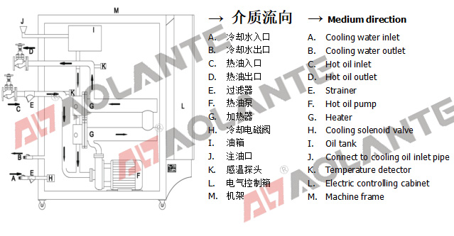 傳熱媒體(油)通過I(油箱)進(jìn)入系統(tǒng),由F(循環(huán)油泵)打到模具后再回到系統(tǒng),周而復(fù)始。媒體(油)在經(jīng)過G(加熱器)升溫,由K(感溫探頭)探測媒體(油)溫度,當(dāng)溫度達(dá)到要求時,G(加熱器)停止工作。當(dāng)溫度需要下降時,H(電磁閥)打開,冷卻水由A經(jīng)過B到H(電磁閥)進(jìn)入熱交換器,熱交換器里的熱水經(jīng)過B排到冷卻水塔,從而間接使熱循環(huán)油系統(tǒng)內(nèi)溫度下降。