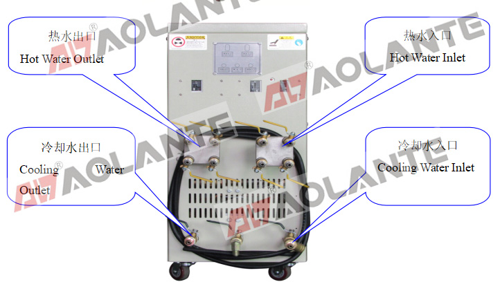 水循環(huán)溫度控制機(jī)特別注意事項(xiàng):管路接頭于120℃以下可使用快速接頭,高于120℃一定要使用油壓接頭,因管路壓力大,請勿使用插芯及管束。
